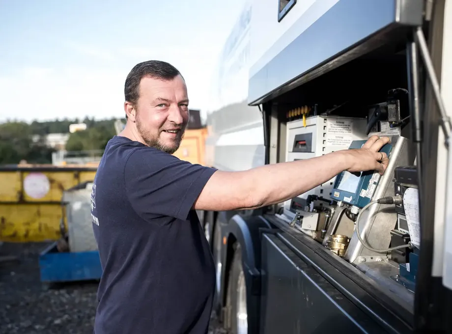 Mitarbeiter bei der Öllieferung auf der Baustelle in Wetzlar.