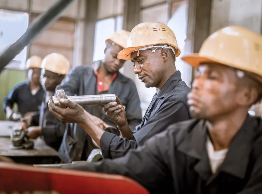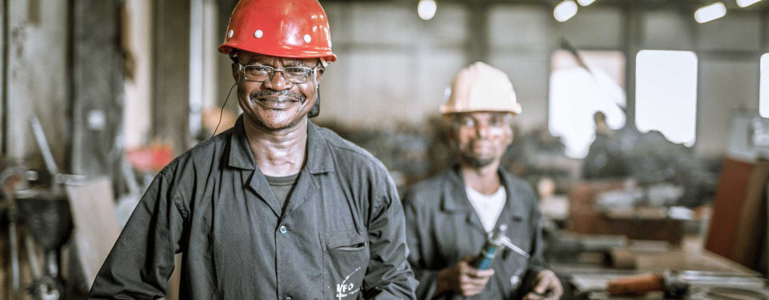 Bildaussage: Einhaltung der Sicherheitsstandards. Mitarbeiter tragen Helme. Mood: Stolze Arbeiter, die ihren Job gerne und zuverlässig verrichten.