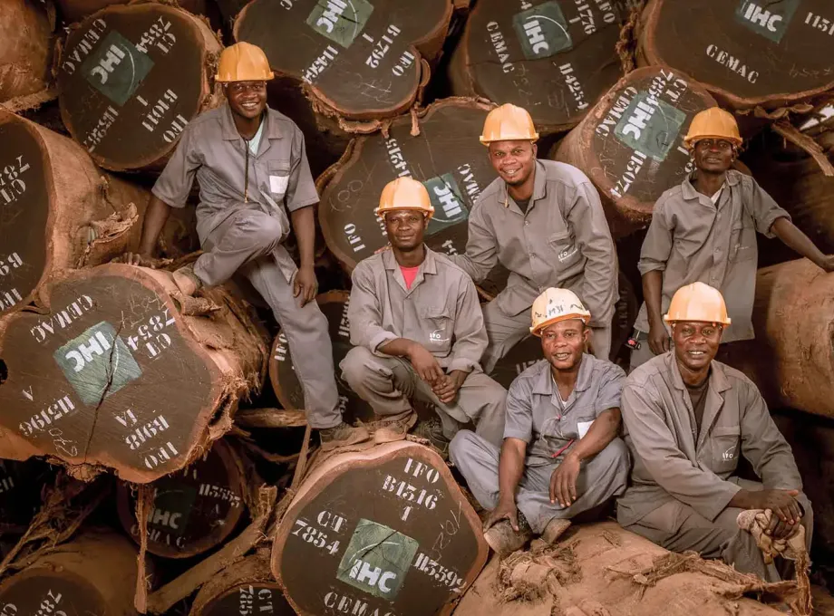 Waldarbeiter vor einem Stapel Tropenholz. Entstanden auf dem Lagerplatz im Camp.
