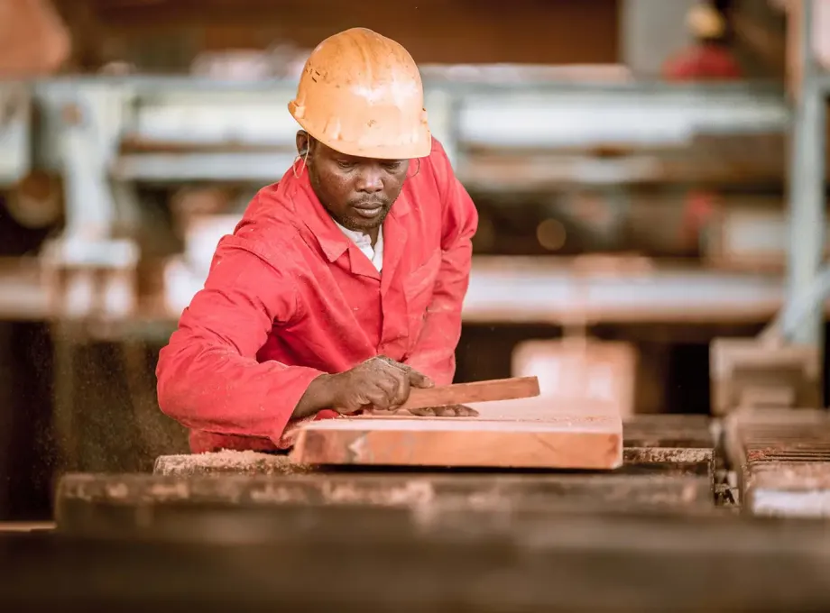 Arbeiter im Holzwerk bei der Oberflächenkontrolle